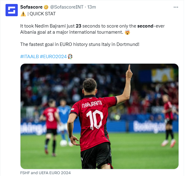 După o aruncare greșită de la margine a lui Dimarco, Bajrami a intrat în posesia mingii și l-a executat pe portarul Donnarumma, în secunda 23. Potrivit statisticienilor de la Sofascore, Bajrami a marcat cel mai rapid gol de la un Campionat European.