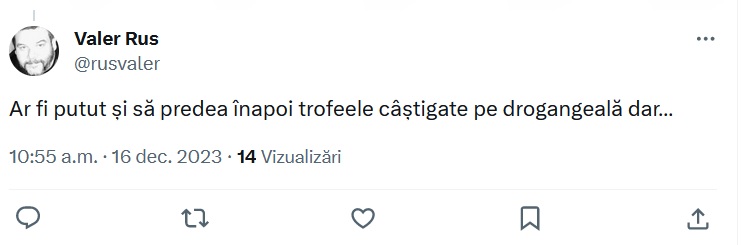 „Ar fi putut și să predea înapoi trofeele câștigate pe drogangeală, dar…”, a scris pe Twitter Valer Rus.