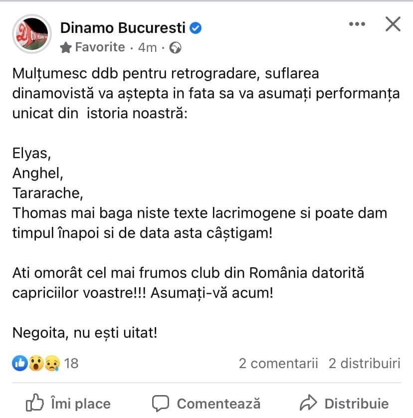 „Mulțumesc, DDB, pentru retrogradare, suflarea dinamovistă vă așteaptă în față să vă asumați performanța unicat din istoria noastră. Elyas, Anghel, Tararache, Thomas mai bagă niște texte lacrimogene și poate dăm timpul înapoi și de data asta câștigăm.
