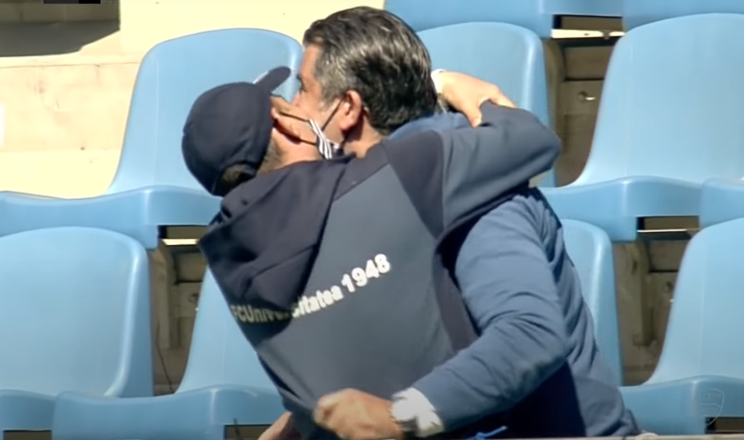 Aflat în tribune alături de președintele Mircea Bornescu, Eugen Trică s-a descătușat și i-a sărit acestuia în brațe. Antrenorul nu s-a putut abține și l-a pupat, cu mască, de mai multe ori pe Bornescu.