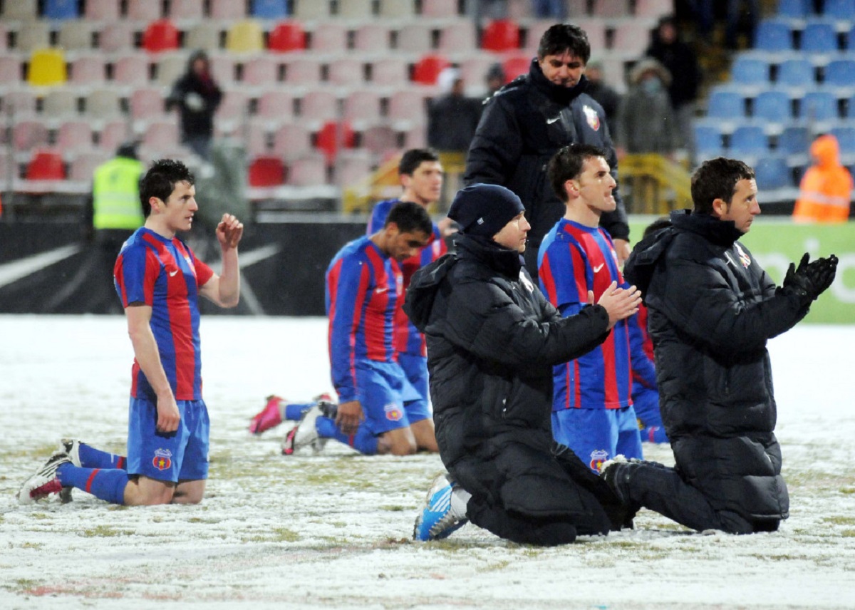 Scenele au semăntat foarte mult cu cele petrecute în Ghencea în martie 2011. Atunci, exista o singură echipă care pretindea că este Steaua și ea a pierdut pe teren propriu cu FC Brașov, scor 0-3. După finalul meciului, la îndemnul lui Mihai Stoica și în frunte cu acesta, jucătorii echipei s-au pus în genunchi în fața galeriei care au scandat ironic „campionii, campionii!”.