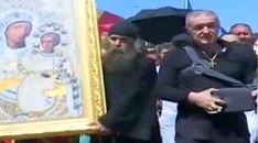 Gigi Becali a cântat refrene bisericești și a mers înconjurat de icoane, asta în ciuda faptului că în urmă cu câteva zile a suferit o intervenție chirurgicală la umărul stâng și încă avea mâna imobilizată.