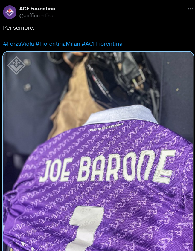 Fanii Fiorentinei au adus un omagiu fostului manager general al echipei, Joe Barone, care a încetat din viață. Acesta a decedat pe 29 martie la Spitalul San Raffaele din Milano, după ce a suferit un stop cardiac cu câteva ore înaintea unei întâlniri din Serie A între Fiorentina și Atalanta, astfel încât meciul a fost imediat anulat.