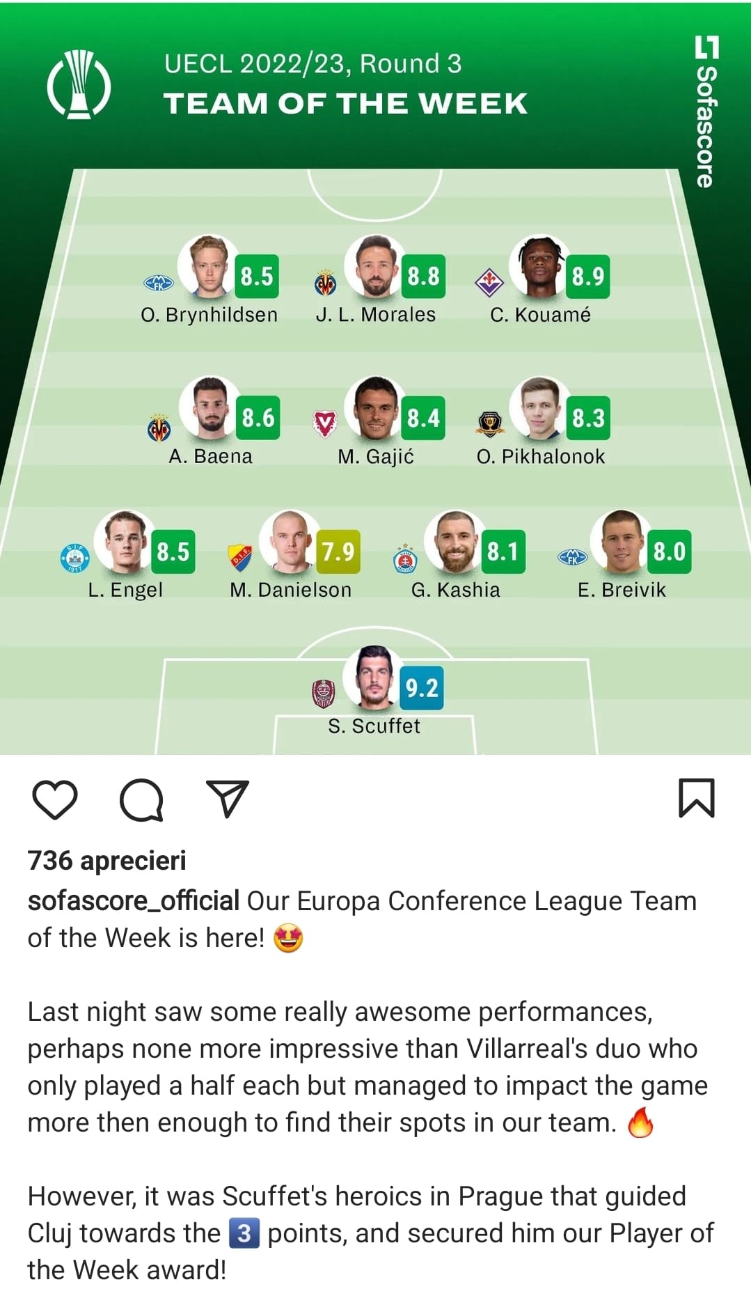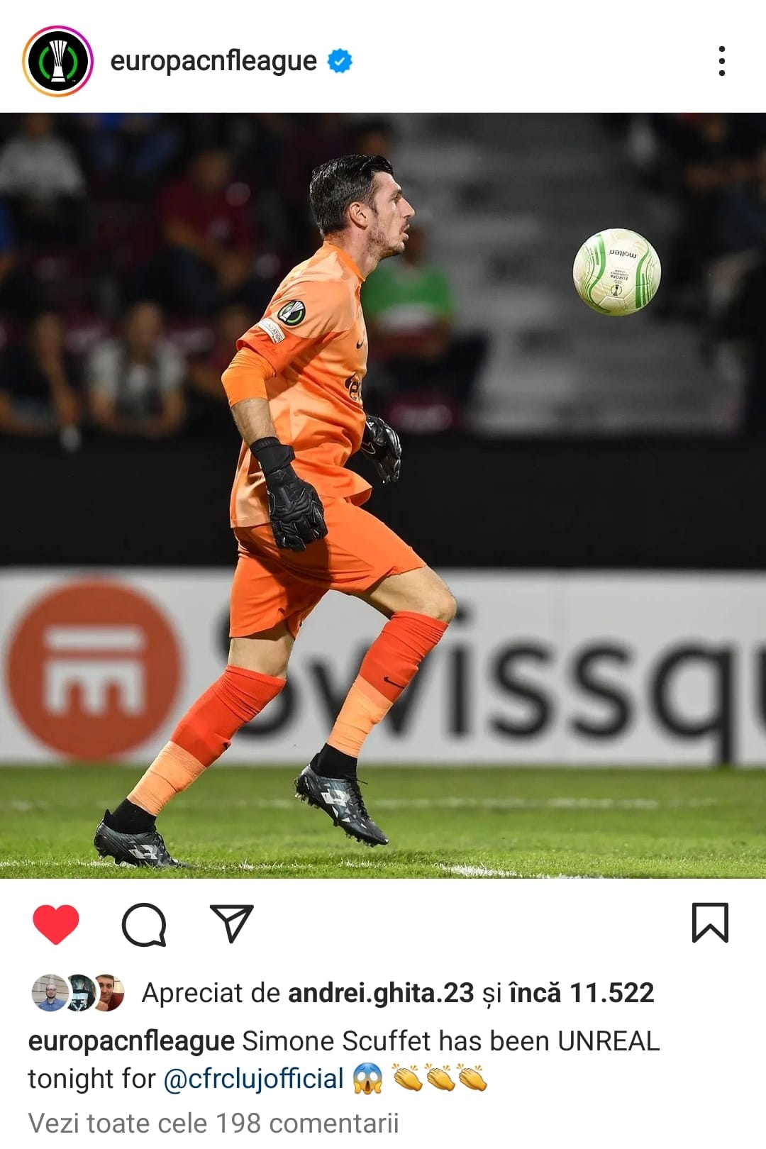 Simone Scuffet a fost fantastic în această seară pentru @cfrclujofficial!”, a apărut pe pagina de Instagram a UEFA Europa Conference League.