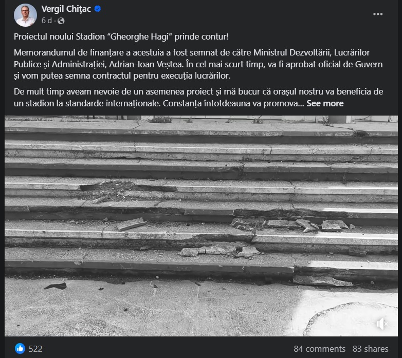 „Proiectul noului Stadion ‘Gheorghe Hagi‘ prinde contur! Memorandumul de finanțare a acestuia a fost semnat de către Ministrul Dezvoltării, Lucrărilor Publice și Administrației, Adrian-Ioan Veștea. În cel mai scurt timp, va fi aprobat oficial de Guvern și vom putea semna contractul pentru execuția lucrărilor”, a declarat Primăria Constanța prin intermediul lui Vergil Chițac, pe Facebook.