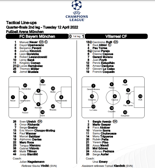 Astfel, Villarreal s-a impus doar cu 1-0, un avantaj minim, despre care cei mai mulți specialiști cred că nu va fi suficient pentru spanioli pentru a-și asigura calificarea în semifinale. Cel mai probabil, Bayern Munchen o va supune pe echipa lui Unai Emery unei presiuni fabuloase pe toată durata meciului.