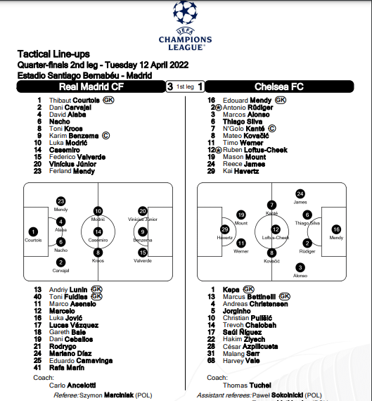 În celălalt meci al serii, Chelsea va avea misiunea aproape imposibilă de a întoarce Real Madrid, chiar pe Santiago Bernabeu. Madrilenii s-au impus cu 3-1 în turul de pe Stamford Bridge, grație unei evoluții demne de cărțile de istorie a lui Karim Benzema, care a marcat trei goluri.