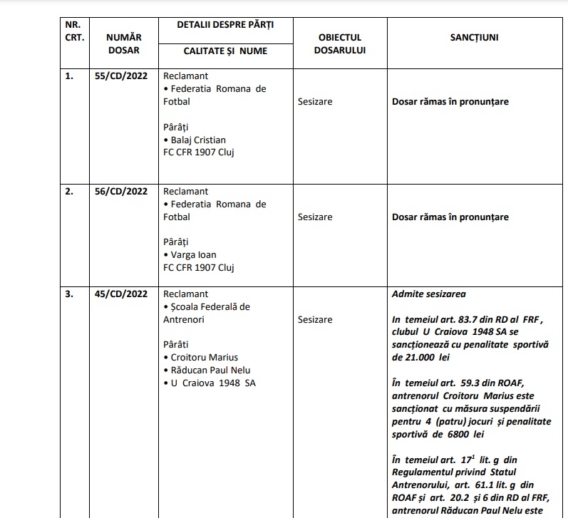 „În temeiul art. 17 lit. g din Regulamentul privind Statul Antrenorului, art. 61.1 lit. g din ROAF și art. 20.2 și 6 din RD al FRF, antrenorul Dună Marin este sancționat cu penalitate de 2000 lei”.