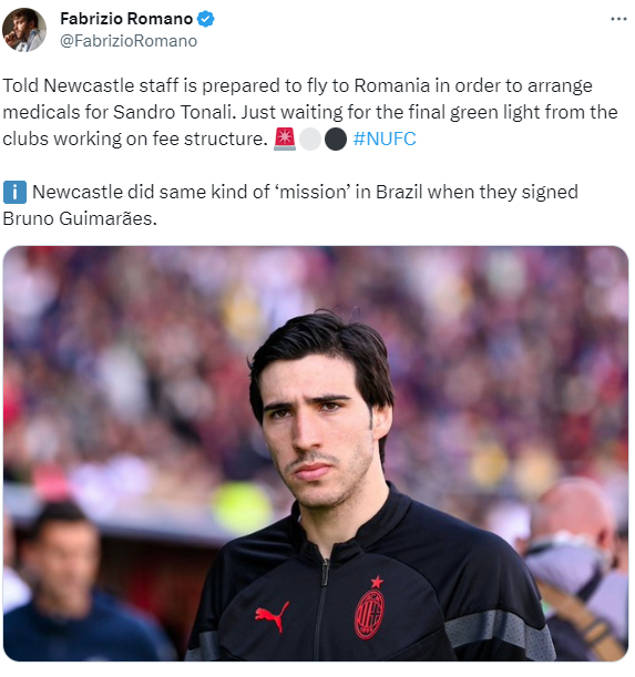 Cunoscutul jurnalist Fabrizio Romano anunță că șeicii lui Newcastle vin astăzi în România pentru a-l ajuta pe Sandro Tonali (23 de ani) să rezolve cât mai rapid vizita medicală, pentru a putea realiza transferul de la AC Milan.