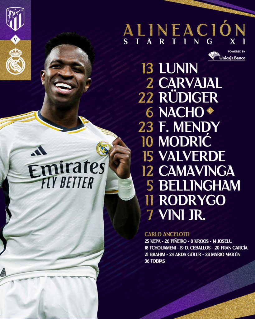 Real Madrid: Lunin – Carvajal, Rudiger, Fernandez, Mendy – Valverde, Camavinga, Modric – Rodrygo, Bellingham, Vinicius