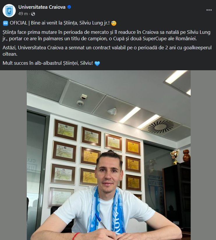 „Bine ai venit la Știința, Silviu Lung jr.! Știința face prima mutare în perioada de mercato și îl readuce în Craiova sa natală pe Silviu Lung jr., portar ce are în palmares un titlu de campion, o Cupă și două SuperCupe ale României.