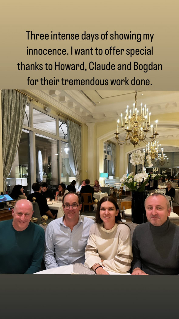 „Trei zile intense în care mi-am arătat nevinovăția. Vreau să le mulțumesc în special lui Howard, Claude și lui Bogdan pentru munca incredibilă pe care au făcut-o”, a scris Simona Halep într-un story pe Instagram.