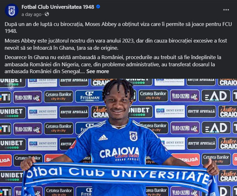 Într-un comunicat oficial, FCU Craiova a anunțat că problemele birocratice ale lui Moses Abbey s-au încheiat și că jucătorul se va alătura echipei pregătite de Marius Croitoru. „După un an de luptă cu birocrația, Moses Abbey a obținut viza care îi permite să joace pentru FCU 1948. Moses Abbey este jucătorul nostru din vara anului 2023, dar din cauza birocrației excesive a fost nevoit să se întoarcă în Ghana. Astăzi, Moses Abbey a primit viza ce îi permite să joace pentru FCU 1948. Săptămâna viitoare, Abbey se va alătura lotului pregătit de Marius Croitoru”, a transmis clubul pe pagina sa de Facebook.
