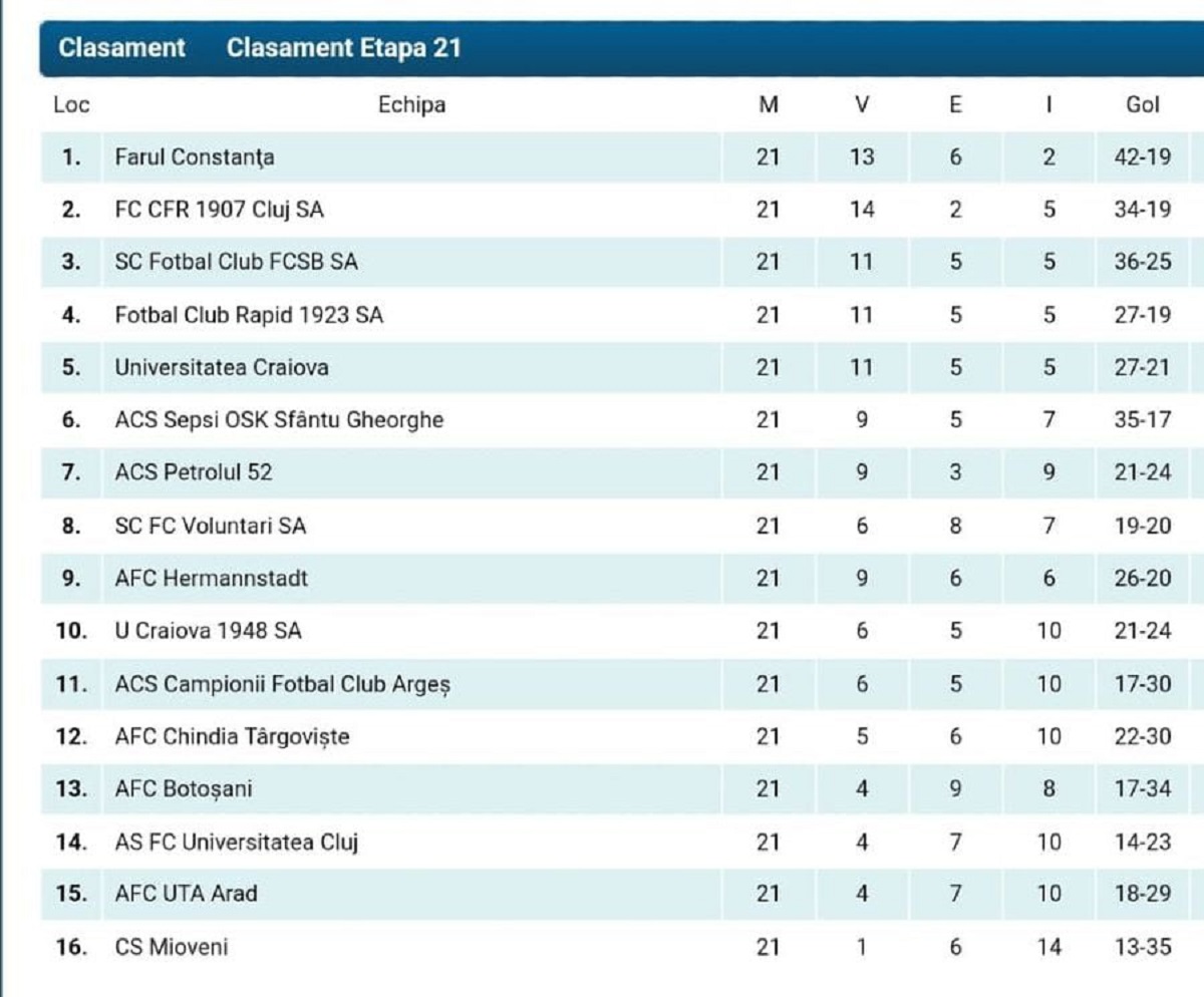 Acest lucru înseamnă că Hermannstadt a căzut de pe locul 6 până pe poziția a 9-a în Superligă. Echipa antrenată de Marius Măldărășanu a fost depășită în clasament de Sepsi Sf. Gheorghe, Petrolul Ploiești și FC Voluntari. Informația a fost confirmată de FRF, care a actualizat pe site-ul oficial clasamentul la zi din prima ligă.