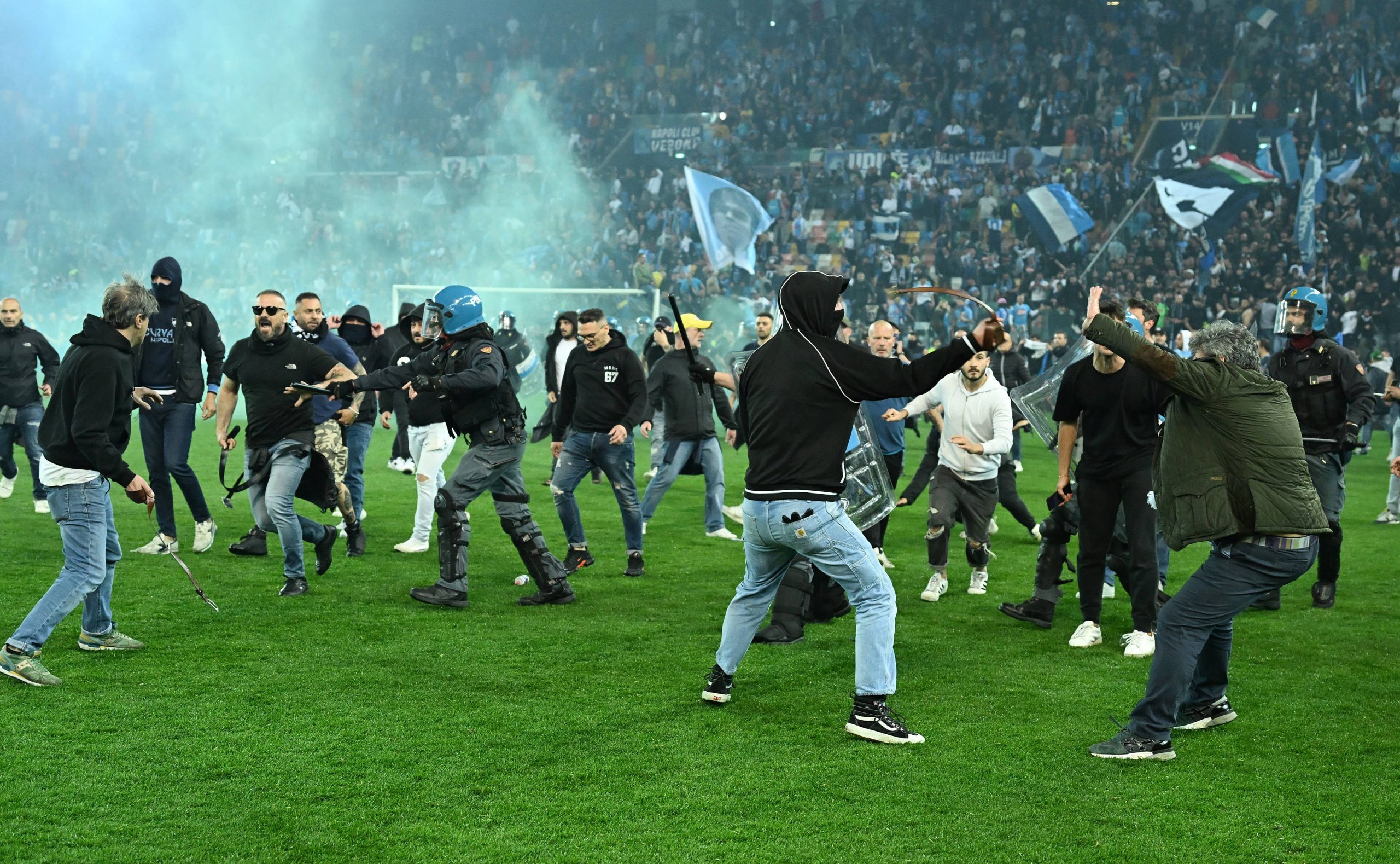 „Nu veți sărbători în casa noastră!” a fost mesajul ultraşilor alb-negri. Transpus în realitate atunci când aceştia au coborât din tribune pentru a-i lovi pe susţinătorii noii campioane a Italiei. În ciuda intervenţiei poliţiştilor, care au folosit şi gaze lacrimogene, doi fani au avut nevoie de spitalizare.
