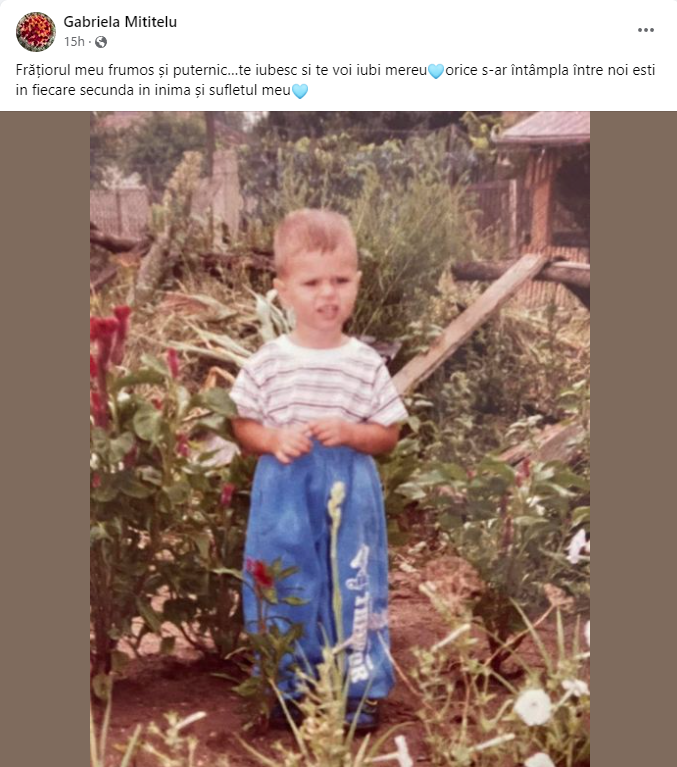 „Frățiorul meu frumos și puternic… Te iubesc și te voi iubi mereu. Orice s-ar întâmpla între noi, ești în fiecare secundă în inima și sufletul meu”, a scris Gabriela Mititelu, pe Facebook.
