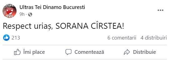 În schimb, fanii dinamoviști au sărit în ajutorul ocupantei locului cu numărul 37 în ierarhia mondială, felicitând-o pentru curajul de a publica un astfel de mesaj. Cu toții i-au împărtășit opinia.