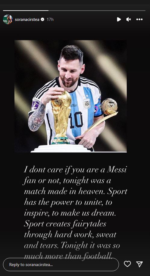 „Nu îmi pasă dacă ești fan Leo Messi sau nu, în seara asta a fost un meci desprins din Rai! Sportul are puterea de a uni, de a inspira, de a ne face să visăm. Sportul generează povești croite prin muncă, sudoare și lacrimi. În seara asta a fost mai mult decât fotbal”, a scris Sorana Cîrstea, într-un Insta Story în care a adăugat și o poză cu Leo Messi, care mângăie trofeul de la Campionatul Mondial, iar în cealaltă mână își ține premiul pentru „cel mai bun jucător al turneului”.