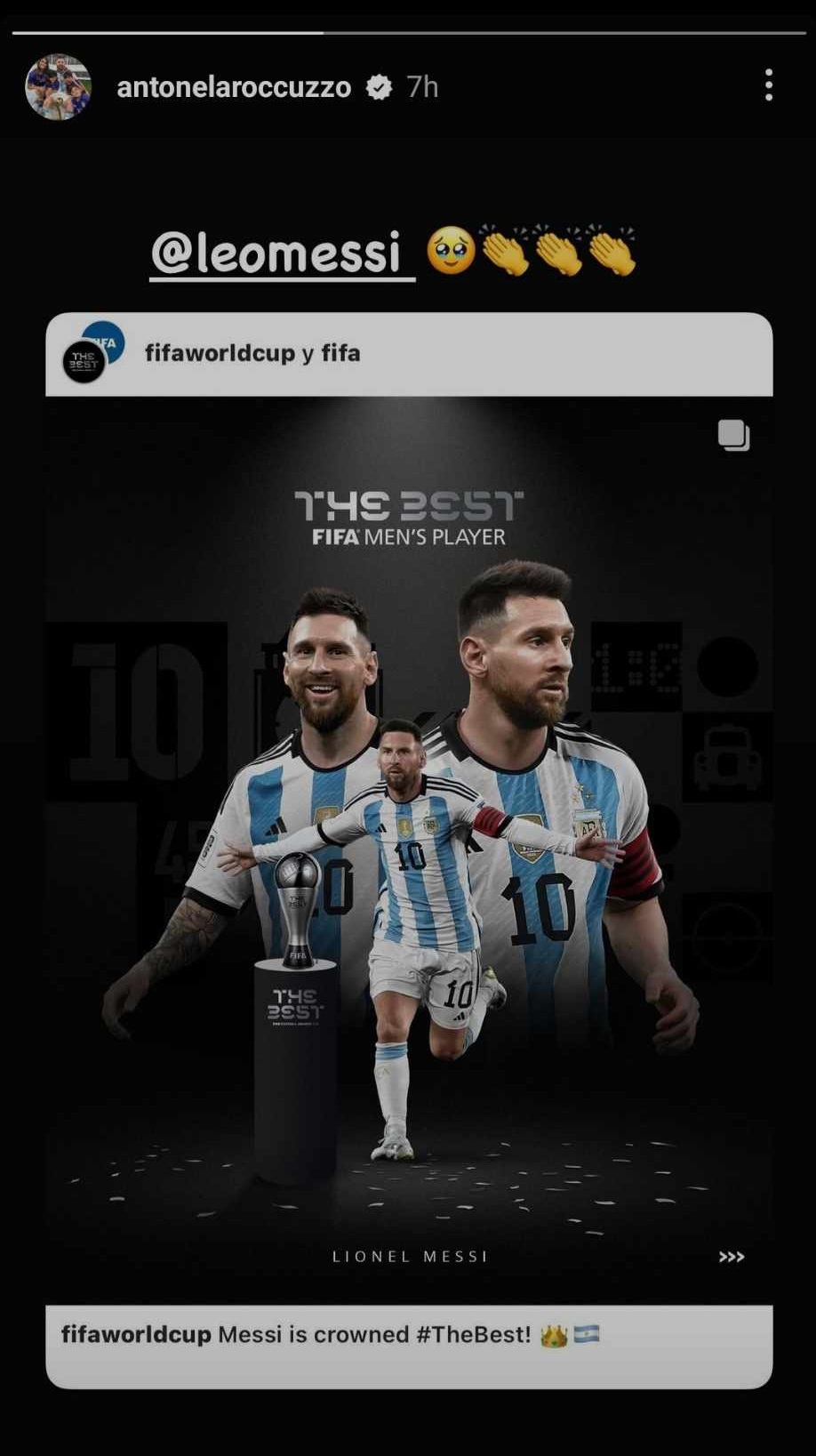 Antonela Roccuzzo a reacționat printr-un story pe Instagram, prin repostarea unei imagini oficiale de la FIFA și tag către Leo Messi. De asemenea, ea adăugat un ochi care lăcrimează și trei emoji-uri cu aplauze.