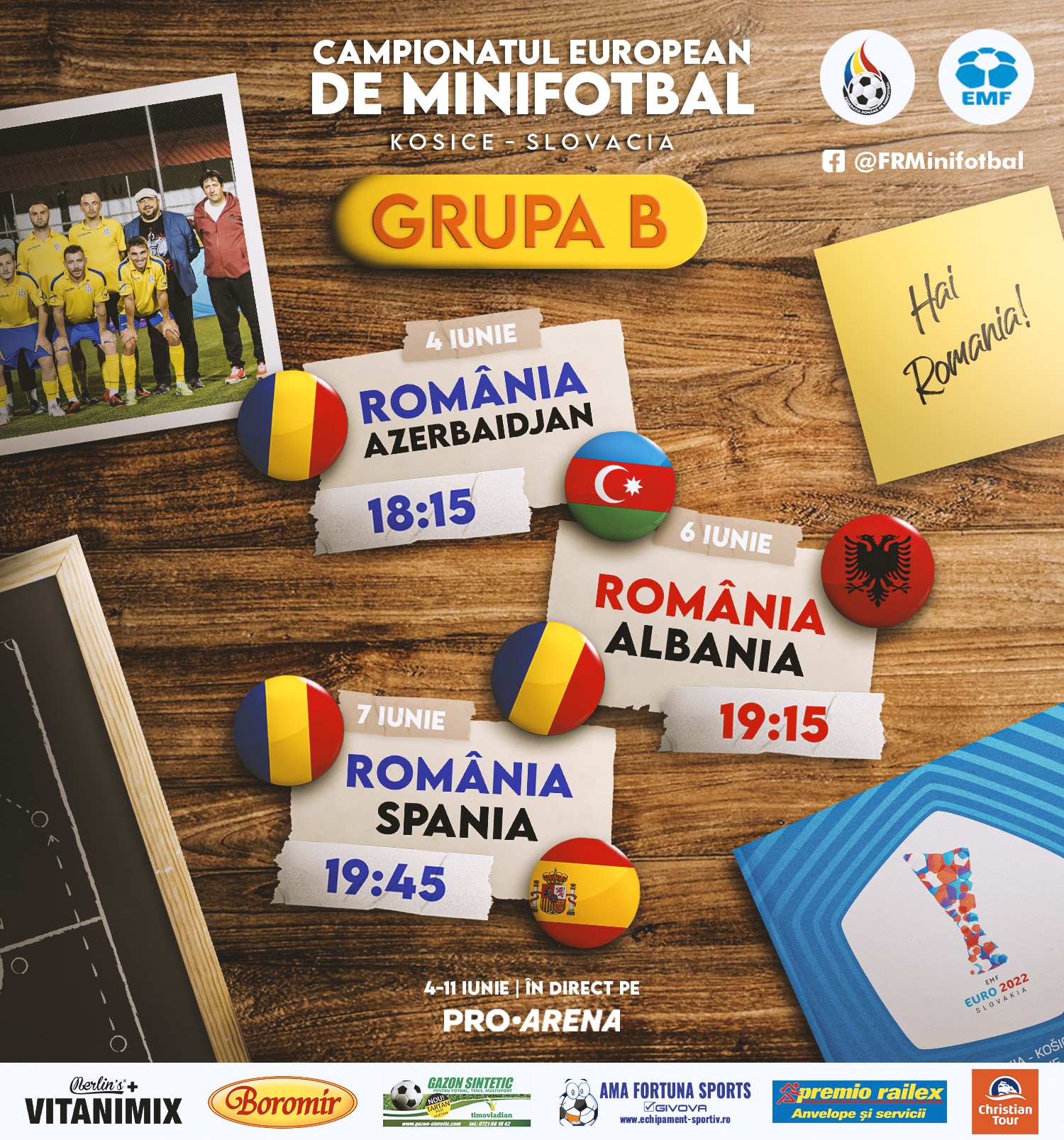 România debutează chiar în prima zi de meciuri la EMF EURO 2022 cu un meci împotriva naționalei din Azerbaidjan. Mai apoi, pe 6 și 7 iunie, „tricolorii” vor întâlni Albania, respectiv Spania.