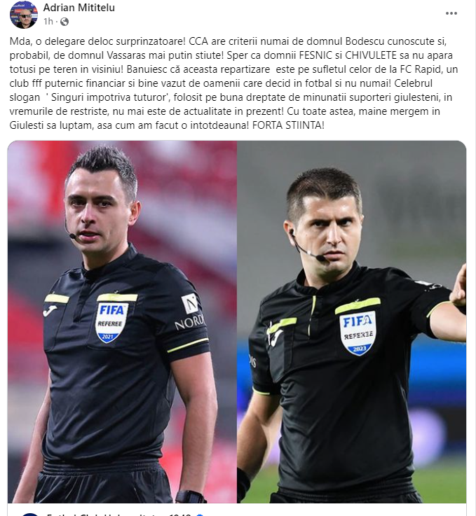 Adrian Mititelu s-a declarat extrem de indignat de delegările pe care Comisia Centrală a Arbitrilor le-a făcut pentru meciul de vineri, lăsând de înțeles că rezultatul partidei ar putea fi influențat de arbitri.