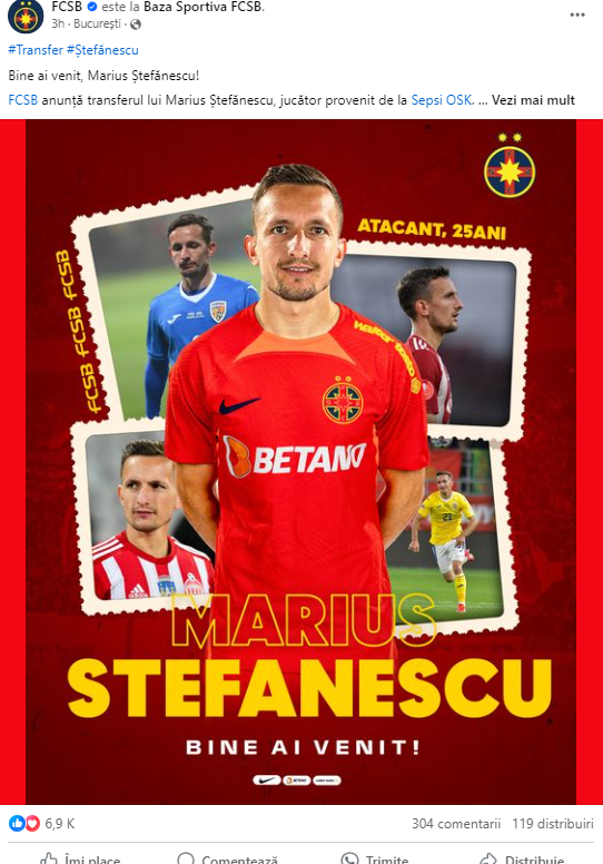 „Bine ai venit, Marius Ștefănescu! FCSB anunță transferul lui Marius Ștefănescu, jucător provenit de la Sepsi OSK. Atacantul în vârstă de 25 de ani a semnat deja contractul și se va alătura lotului în cantonamentul echipei din Țările de Jos.