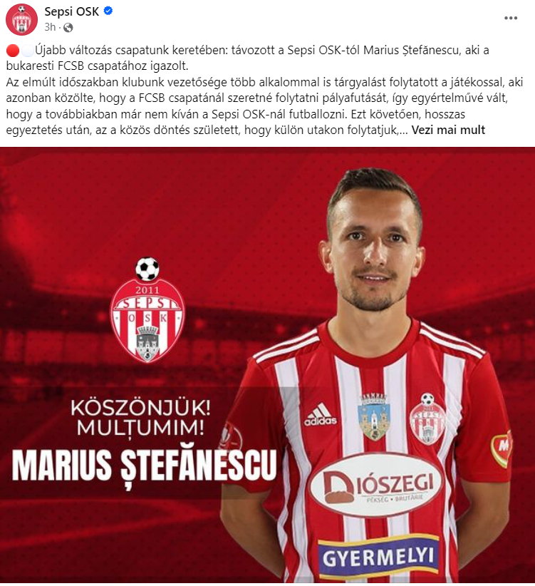 „Noi schimbări în lotul echipei: Marius Ștefănescu s-a transferat definitiv la FCSB. În ultima perioadă, conducerea clubului Sepsi OSK a avut mai multe discuții cu Marius Ștefănescu, dar jucătorul a comunicat că vrea să își continue cariera la FCSB, fiind evident pentru toată lumea că nu mai dorește să rămână la Sepsi OSK.