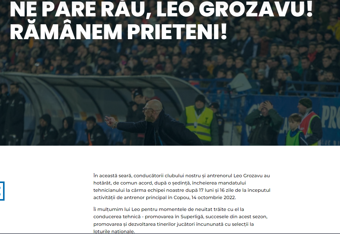 „În această seară, conducătorii clubului nostru și antrenorul Leo Grozavu au hotărât, de comun acord, după o ședință, încheierea mandatului tehnicianului la cârma echipei noastre, după 17 luni și 16 zile de la începutul activității de antrenor principal în Copou, la 14 octombrie 2022.