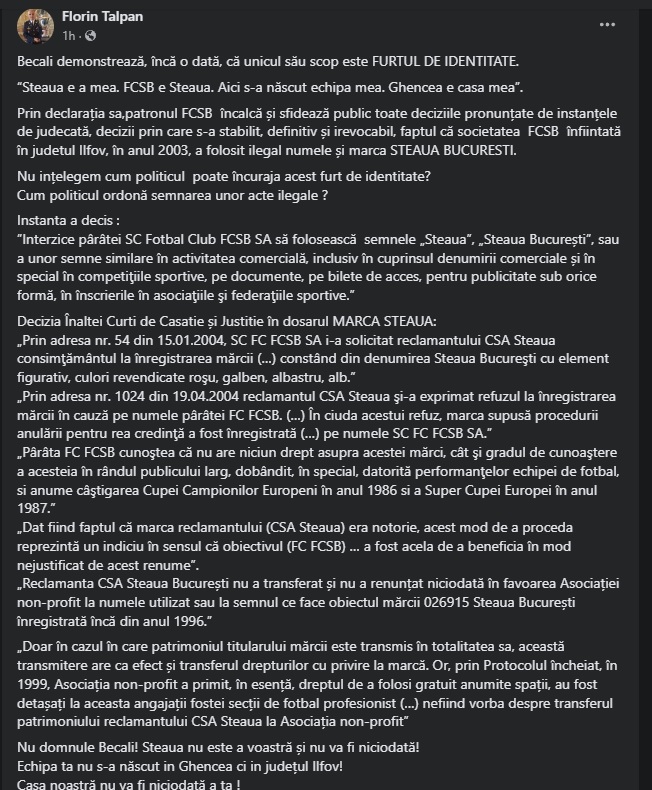 Într-un mesaj postat pe Facebook, avocatul îl atacă dur pe Stoica, cel care a cerut „control medical” pentru Talpan. Angajatul CSA se referă și la procesul legat de recuperarea prejudiciului și îl asigură pe Meme că FCSB nu va intra în Ghencea la meciul cu Dinamo.