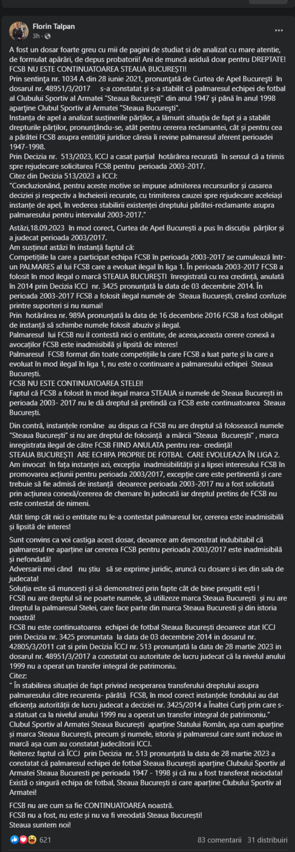 Florin Talpan, juristul CSA Steaua, a oferit noi detalii despre disputa din instanţă cu FCSB.