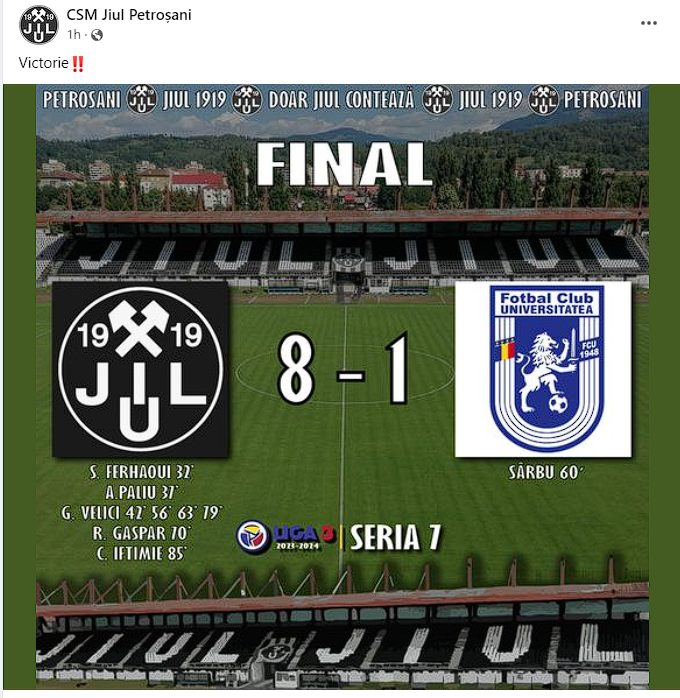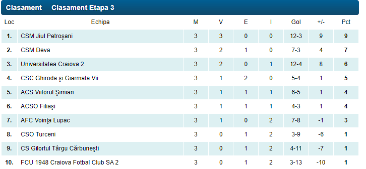 În cadrul etapei cu numărul trei, din Liga a treia, FCU Craiova a pierdut cu 8-1 pe terenului Jiului Petroșani.