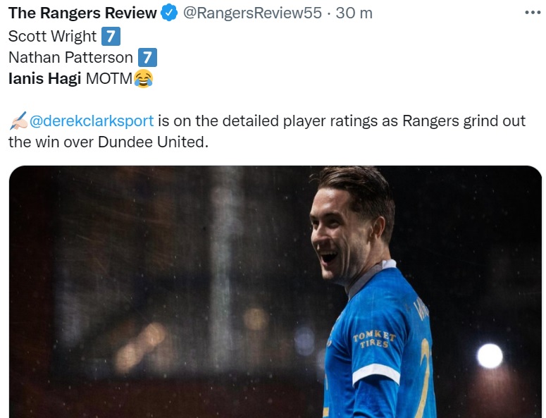 Ianis Hagi a fost titular pentru Rangers, în partida cu Dundee United, din etapa a 19-a din Premier Scottish League. Gazdele au câștigat prin golul lui Tavernier, din minutul 71, care a fructificat un penalty. Mijlocașul român a fost ales omul partidei, deși nu s-a remarcat cu nimic.