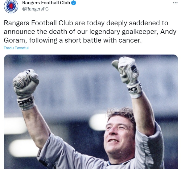 Rangers Football Club este astăzi profund întristat să anunțe moartea portarului nostru legendar, Andy Goram, în urma unei scurte lupte cu cancerul