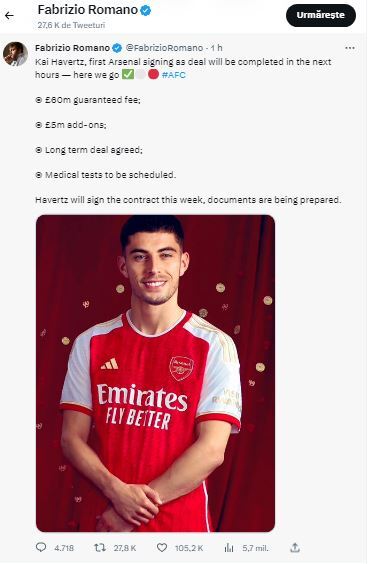 „Kai Havertz, primul transfer al lui Arsenal, va fi finalizat în următoarele ore. 60 de milioane de euro, suma garantată, 5 milioane bonusuri, contract pe termen lung. Vizita medical urmează să fie programată. Havertz va semna contractul în această săptămână, documentele sunt în curs de pregătire”, a dezvăluit Fabrizio Romano, jurnalistul care s-a făcut remarcat pentru predicțiile din perioadele de mercato.