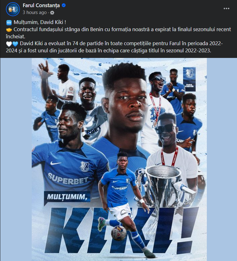 „Mulțumim, David Kiki! Contractul fundașului stânga din Benin cu formația noastră a expirat la finalul sezonului recent încheiat. David Kiki a evoluat în 74 de partide în toate competițiile pentru Farul în perioada 2022-2024 și a fost unul din jucătorii de bază în echipa care câștiga titlul în sezonul 2022-2023”, a fost mesajul postat pe Facebook de Farul Constanța.