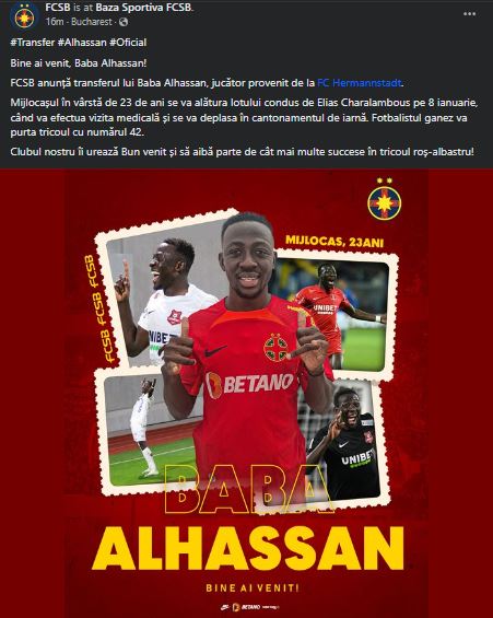 FCSB anunță transferul lui Baba Alhassan, jucător provenit de la FC Hermannstadt.