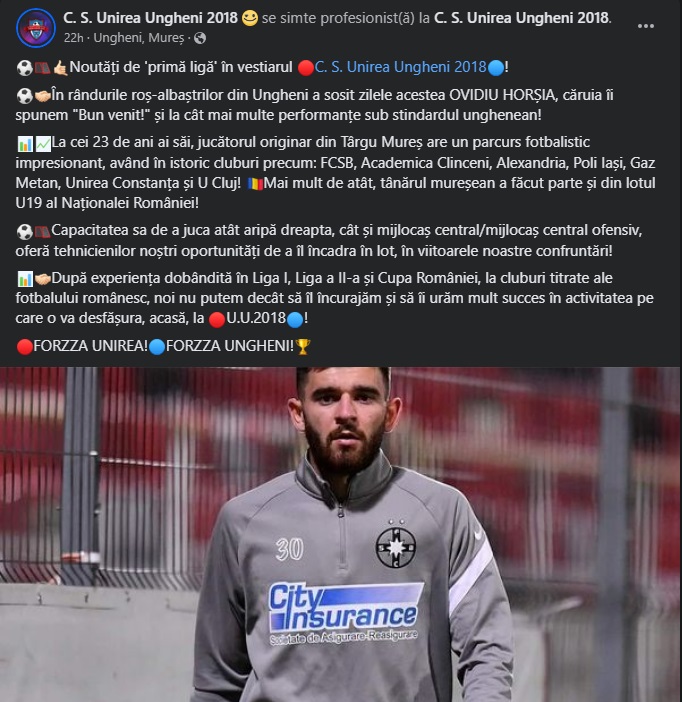 „În rândurile roș-albaștrilor din Ungheni a sosit zilele acestea OVIDIU HORȘIA, căruia îi spunem „Bun venit!” și la cât mai multe performanțe sub stindardul unghenean! La cei 23 de ani ai săi, jucătorul originar din Târgu Mureș are un parcurs fotbalistic impresionant, având în istoric cluburi precum: FCSB, Academica Clinceni, Alexandria, Poli Iași, Gaz Metan, Unirea Constanța și U Cluj Mai mult de atât, tânărul mureșean a făcut parte și din lotul U19 al Naționalei României!