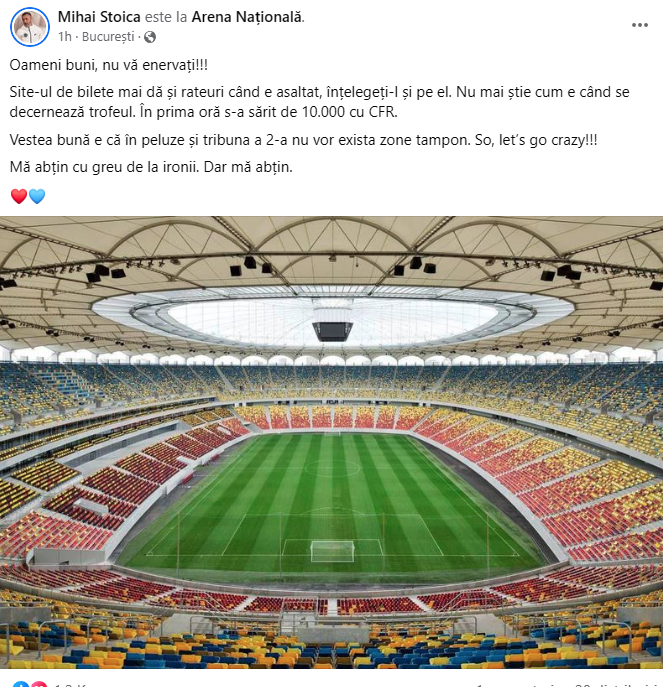 Site-ul de bilete mai dă și rateuri când e asaltat, înțelegeți-l și pe el. Nu mai știe cum e când se decernează trofeul. În prima oră s-a sărit de 10.000 cu CFR.