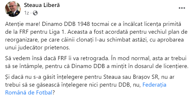 „Atenție mare! Dinamo DDB 1948 tocmai ce a încălcat licența primită de la FRF pentru Liga 1. Aceasta a fost acordată pentru vechiul plan de reorganizare, pe care «câinii» clonați l-au schimbat cu aprobarea unui judecător prietenos.