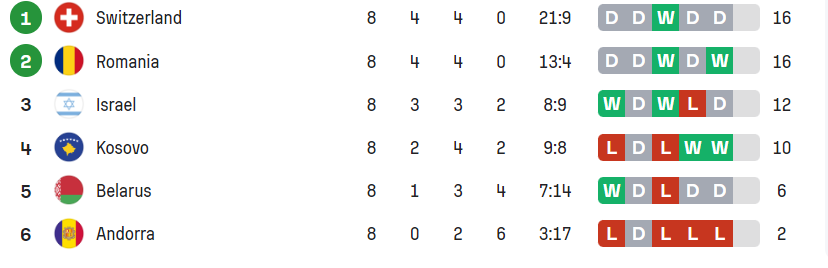 La ora actuală avem 16 puncte și 4 avans față de selecționata din „Țara Sfântă”. În cazul egalității de puncte, primul criteriu de departajare este dat de rezultatele înregistrate în confruntările directe. Următorul este golaverajul, capitol la care stăm mai bine.