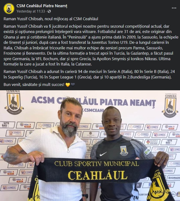 Ceahlăul Piatra Neamț a anunțat oficial semnarea unui contract cu fotbalistul ghanez Raman Yussif Chibsah, în vârstă de 31 de ani, care are și cetățenie italiană. Chibsah a semnat un contract valabil pentru acest sezon, cu posibilitatea de prelungire pentru vara viitoare.