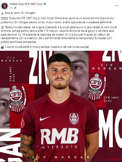 „Cluburile CFR 1907 Cluj și Ironi Kiryat Shmona au ajuns la un acord privind împrumutul jucătorului Ziv Morgan pentru un an, clubul nostru având opțiunea de cumpărare definitivă! Tânărul fundaș lateral, de origine israeliană, a evoluat până acum în țara natală, la Ironi Kiryat Shmona, echipă pentru care a bifat 113 meciuri, reușind să înscrie două goluri și să ofere șase pase decisive.