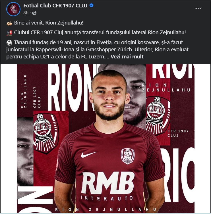 CFR Cluj a realizat un nou transfer, Rion Zejnullahu, un fundaș stânga în vârstă de 19 ani.