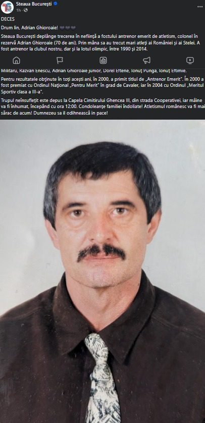 ”Drum lin, Adrian Ghioroaie! Steaua București deplânge trecerea în neființă a fostului antrenor emerit de atletism, colonel în rezervă Adrian Ghioroaie (70 de ani). Prin mâna sa au trecut mari atleți ai României și ai Stelei. A fost antrenor la clubul nostru, dar și la lotul olimpic, între 1990 și 2014.