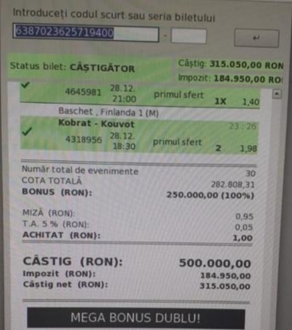 Cele 30 de bilete pe care a mizat pariorul au avut, fiecare, câte 30 de evenimente, cele mai multe din baschet și volei. Persoana, care se pare că este din Horezu, Vâlcea, a mizat câte un leu pe fiecare bilet. Astfel, cu doar 30 de lei investiți, pariorul s-a ales cu 15 milioane de lei (150 de miliarde vechi).