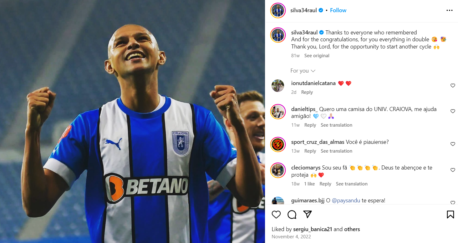 După barajul pentru Conference League, Raul Silva a postat pe Instagram un mesaj emoționant: „Noapte magică. Sfârșitul unui lucru este mai bun decât începutul lui. Mulțumesc, Doamne”. Mesajul a fost apreciat și comentat de mai mulți colegi, printre care Andrei Ivan și Daniel Bană, care l-au alintat pe Silva „Tataie”.