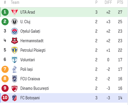 UTA se află pe primul loc în playout, cu 27 de puncte obținute, în timp ce FC Botoșani ocupă ultimul loc, cu 14 puncte.