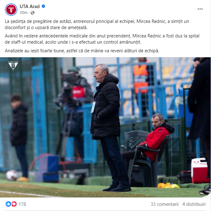 Update 17:15. UTA a emis un comunicat oficial prin care anunță că analizele lui Mircea Rednic au ieșit bine, astfel că marți va reveni la antrenamentele echipei.