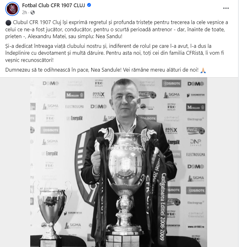 Clubul CFR 1907 Cluj își exprimă regretul și profunda tristețe pentru trecerea la cele veșnice a celui ce ne-a fost jucător, conducător, pentru o scurtă perioadă antrenor – dar, înainte de toate, prieten -, Alexandru Matei, sau simplu: Nea Sandu!