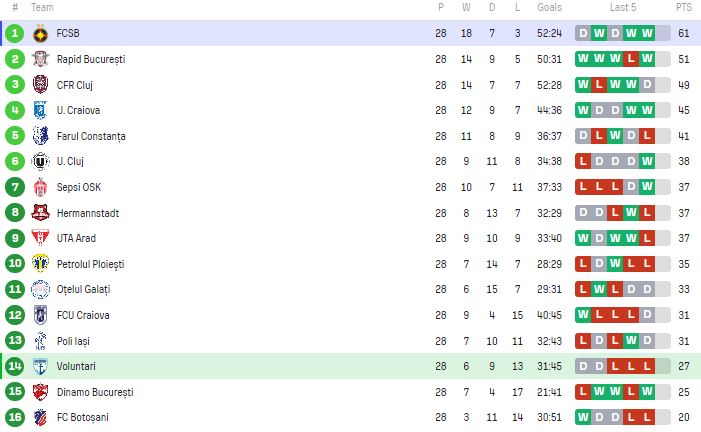 FCSB vrea o victorie care să o ducă la 10 puncte de Rapid și 12 de CFR Cluj, în clasament. De partea cealaltă, FC Voluntari este amenințată de echipele de pe locurile retrogradabile, iar trei puncte sunt esențiale pentru Dică și elevii lui.